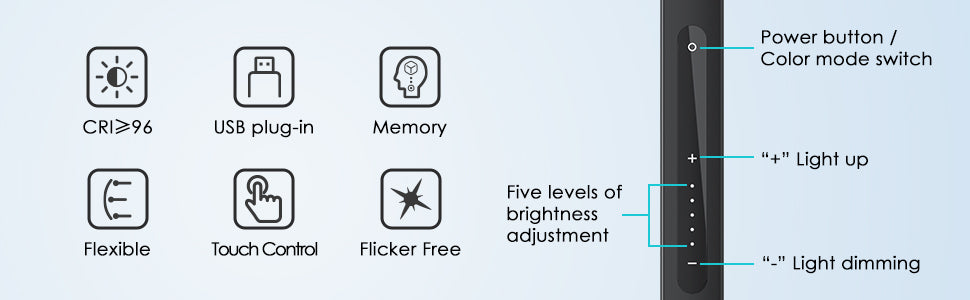 • 【3 Color & 5-Way Dimmable】Viozon 7" desk lamp has 3 kinds of light :cold/warm/nature(3100k-6400k). 5 levels brightness of each color light. CRI≥96. You can use the touch panel on the arm of light to choose the most comfortable light to control the appearance and feel of your space. The light set includes USB power supply cable + extension cable, can be charged by laptop, computer, power bank, USB charger, etc.